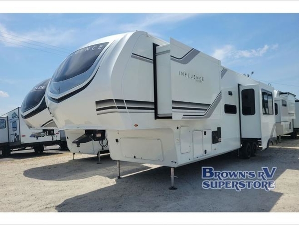 Any Grand Design Influence fifth wheel features five-sided aluminum cage construction with a walk-on roof and a fully enclosed underbelly with heated tanks and storage for all weather camping. For peace of mind, the MORryde CRE3000 Suspension system will provide safe and smooth towing, and the 101" widebody construction offers all the room you need and that is before multiple slides are fully engaged. You will appreciate the Keyed-Alike locks, slam-latch baggage doors with magnetic door catches, exterior security light, and SolidStep entry steps. On the inside, Congoleum flooring, premium roller shades for privacy, a hallway handrail for safety, and nightstands with USB ports to keep all of your electronics fully charged. You will also love the On Demand tankless water heater when showering, plus the added heat and ambiance from an electric fireplace, and so much more!