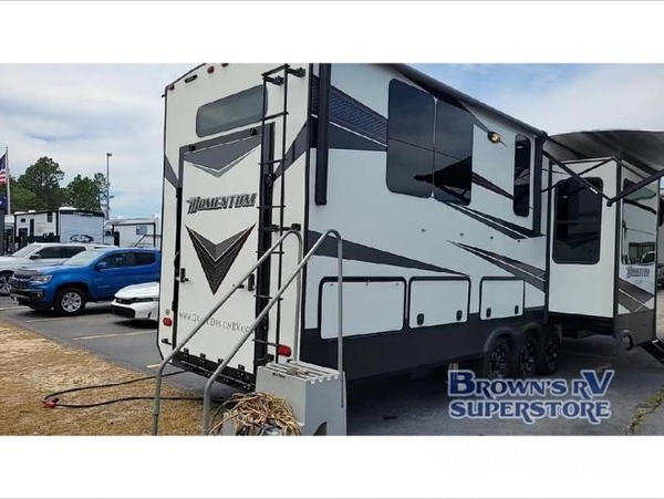 When you are ready for some off-road fun, hitch up this toy hauler fifth wheel to head to your favorite trails! This Momentum 376TH has a unique below floor garage with a bedroom above. After a busy day on the dunes, you can entertain guests in the front living area which includes a telescoping 49" LED TV with fireplace. You will find the separate kitchen area has all the amenities necessary to make and eat meals including a free standing dinette and large pantry. You can even add a washer and dryer in the second pantry if you want to keep your clothes clean the whole trip. You may choose to cook outdoors on the outside kitchen while watching the exterior LED TV. There is much more to see inside and outside this toy hauler!