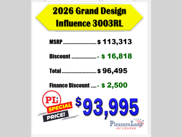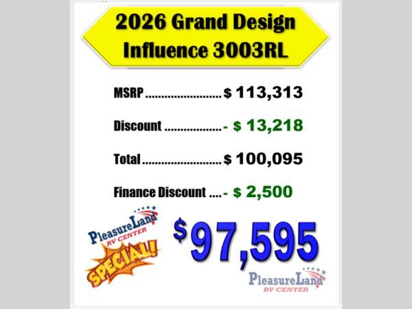 Any Grand Design Influence fifth wheel features five-sided aluminum cage construction with a walk-on roof and a fully enclosed underbelly with heated tanks and storage for all weather camping. For peace of mind, the MORryde CRE3000 Suspension system will provide safe and smooth towing, and the 101" widebody construction offers all the room you need and that is before multiple slides are fully engaged. You will appreciate the Keyed-Alike locks, slam-latch baggage doors with magnetic door catches, exterior security light, and SolidStep entry steps. On the inside, Congoleum flooring, premium roller shades for privacy, a hallway handrail for safety, and nightstands with USB ports to keep all of your electronics fully charged. You will also love the On Demand tankless water heater when showering, plus the added heat and ambiance from an electric fireplace, and so much more!