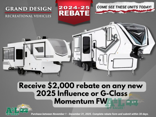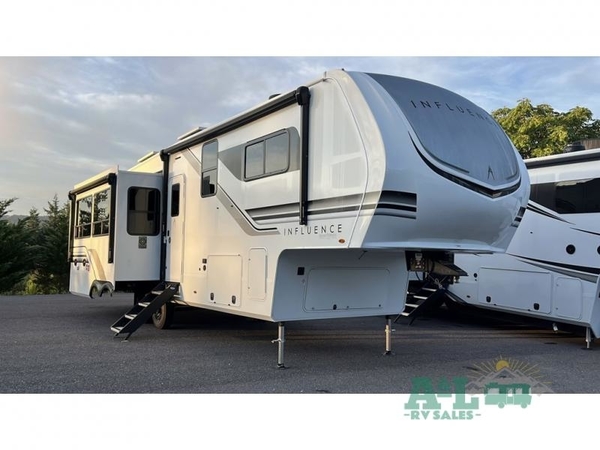 Any Grand Design Influence fifth wheel features five-sided aluminum cage construction with a walk-on roof and a fully enclosed underbelly with heated tanks and storage for all weather camping. For peace of mind, the MORryde CRE3000 Suspension system will provide safe and smooth towing, and the 101" widebody construction offers all the room you need and that is before multiple slides are fully engaged. You will appreciate the Keyed-Alike locks, slam-latch baggage doors with magnetic door catches, exterior security light, and SolidStep entry steps. On the inside, Congoleum flooring, premium roller shades for privacy, a hallway handrail for safety, and nightstands with USB ports to keep all of your electronics fully charged. You will also love the On Demand tankless water heater when showering, plus the added heat and ambiance from an electric fireplace, and so much more!