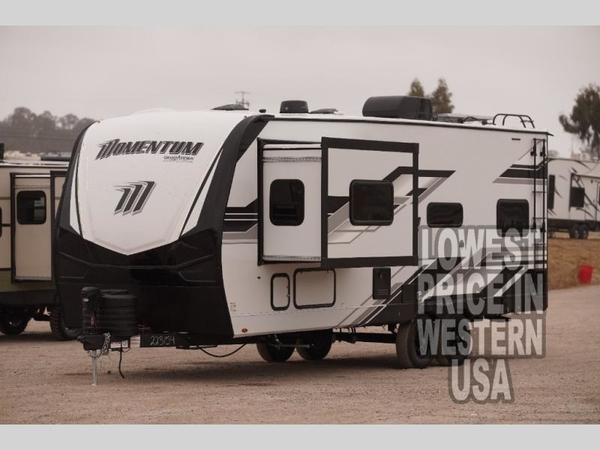 Are you looking for adventure and fun? The Momentum G-Class toy hauler by Grand Design will help you find it! You can explore during any season you choose with the Insulation Package that includes a heated and enclosed underbelly with suspended tanks, a high-capacity furnace, a moisture barrier floor enclosure, and cabinet-mounted heat ducts. Each model includes a fuel station with an interior and exterior gauge, a dovetail rear rend, and 2,500-LB tie-downs anchored into the chassis. Throughout the Momentum G-Class interior, you'll enjoy many comfortable features like large panoramic windows, a shower skylight, USB chargers in the bedroom, and residential cabinetry.