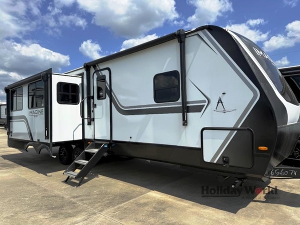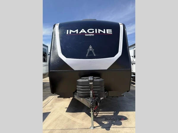 This Imagine travel trailer has opposing slides to provide you with ample living space on the interior once you've parked and set up! You can use the tri-fold sofa and theater seating to relax, and the booth dinette is another seating space that you can use for dinner time or game nights. The entertainment center has a LED HDTV with fireplace below, which is great for movie night.  When outside, you will love the two power awnings to sit beneath to keep you protected from the sun while you have fun at your campsite. The exterior also offers you an LP quick connect and a coax TV hookup.