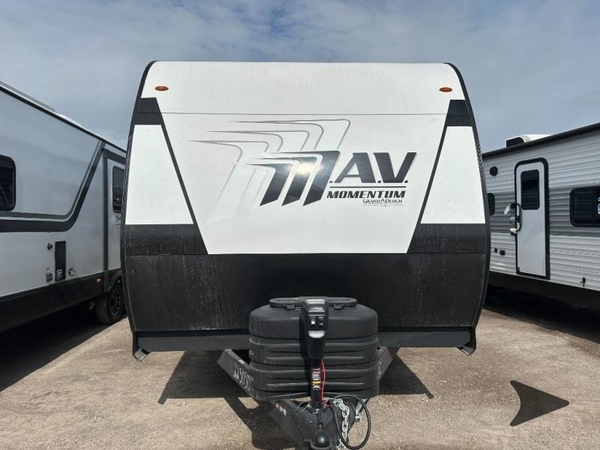 The Momentum MAV toy hauler travel trailers by Grand Design are designed to provide exactly what you need. The spacious garage provides tons of cargo space, with no wheel wells to get in the way. Additional storage includes magnetic storage door catches, and overhead consoles throughout. Conveniences like motion sensor lights and USB outlets will make your life easier, and you will be comfortable in all seasons with the 30K BTU furnace plus 15K BTU ducted air conditioning. The standard Solar Package comes with a 180W solar panel, a 40 Amp charge controller with Bluetooth, and a 12V refrigerator so you can go off-grid when the adventure calls for it.