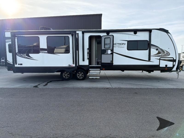The chef of the group will love the gourmet kitchen including the 16 cu. ft. refrigerator that will hold lots of cold ingredients, beverages and leftovers, the center island when preparing and serving meals, and the hutch with overhead cabinets to display decor and store dishes and such. This area also includes two slide outs for more floor space and furniture to relax on including theatre seating with cupholders for your drinks, a booth dinette to dine at and work from or choose a free standing dinette option, and a rear tri-fold sofa that offers sleeping space for two at night. There is a 40" LED HDTV with fireplace below to enjoy while inside, plus there are two awnings outdoors to relax under. When you are ready to call it a night, get cleaned up in the full bathroom, and retire to your front bedroom with a slide out queen bed or choose a king option, a front full-wall wardrobe with washer/dryer prep, a dresser and an additional wardrobe with drawers.