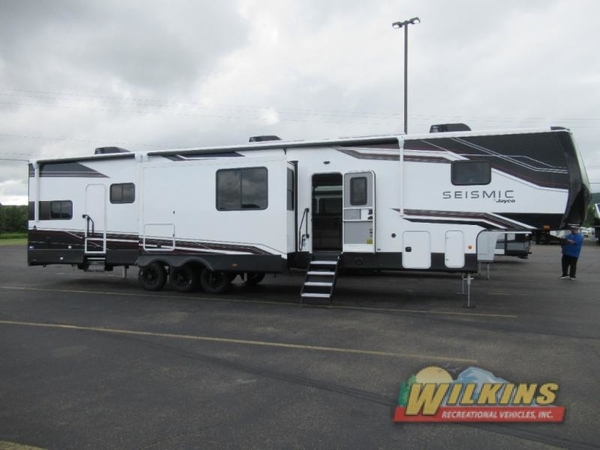 One look at the Seismic toy haulers by Jayco, and you'll never go back! Each model features a custom automotive-grade vinyl exterior graphics package, a painted fiberglass front cap with built-in LED lighting, and 102" wide-body structural steel I-beam construction. You'll find the pass-through storage with Slam-Latch baggage doors will make unpacking easier than ever, and the rear ramp door/patio with anti-slip, non-skid flooring will allow you to unload your toys with no trouble at all. These toy haulers feature a three seasons garage wall/doors, a 30 gallon fuel tank with a timer, and exterior marine-grade speakers to keep the party going. The Climate Shield zero degree tested weather protection includes a 35,000 BTU furnace, PEX plumbing, and a fully enclosed and heated underbelly so you can enjoy your adventures year around. And we haven't even touched on the interior luxuries you'll find, like solid hardwood cabinet doors, residential vinyl flooring made in the USA, night shades, and more!