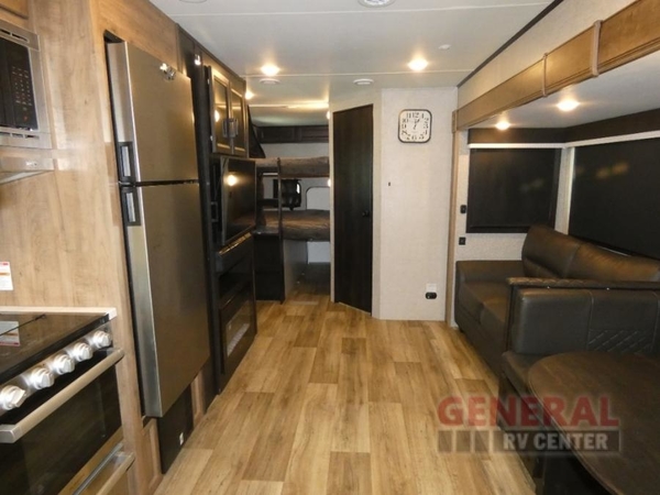 There's a lot to love about this travel trailer! From the set of 48" x 80" bunk beds with storage in the steps to the walk-in pantry behind the swing-out entertainment center with a fireplace for a cozy evening indoors. Everyone can freshen up in the rear corner bathroom with the shower, keep their towel close by with the linen closet, and have plenty of countertop space to get ready in the mornings. The tri-fold sofa and U-shaped dinette slide offer comfortable places to sit, dine, and play games, as well as transform into extra sleeping spaces. The front private bedroom has a queen bed with wardrobes on either side and another wardrobe to keep your clothes looking their best. You even have an outside kitchen to cook your meals at while watching others play a game of cornhole!