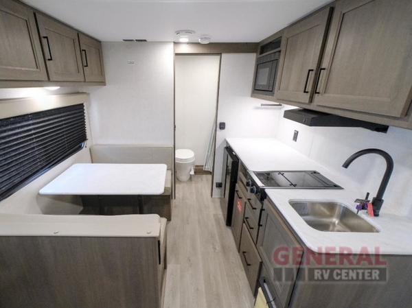 This is the perfect couple's trailer with versatile seating and sleeping space! You'll find a queen-size Murphy bed up front with storage space beside and above plus a full rear bath for added privacy. Once you've made lunch in the full kitchen, you can dine at the booth dinette, or take your plate outdoors to sit under the 10' power awning. You'll also find an unobstructed pass-thru storage outside that will be perfect for fishing poles, lawn chairs, tools and more!