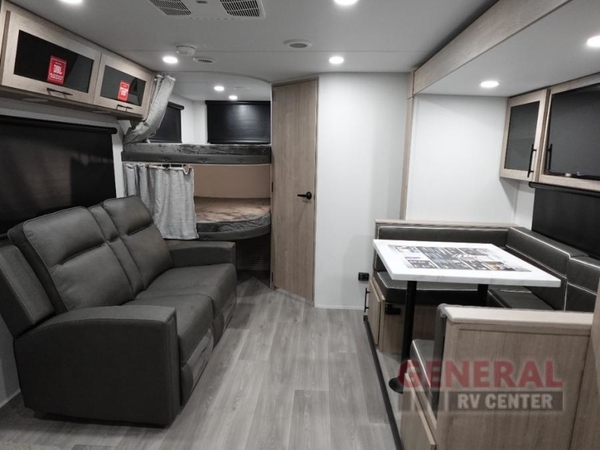 The dual entry doors make it easy to enter and exit this travel trailer! You will find a walk-around queen-size bed up front in the private bedroom, and one of the entry/exit doors to the unit so you can quietly slip out for an early morning fishing trip. The U-shaped dinette is right next to the window, so you can look out at your surroundings while you enjoy breakfast. The double-size bunks have some privacy curtains, and the bunks are right next to the full bathroom for easy access in the middle of the night. The fully equipped kitchen has everything you need to get dinner in the oven, and you can have some more prep space by using the flip-up countertop extension. You even have an outdoor griddle and an outdoor 1.6 cu. ft. refrigerator to enjoy a cold beverage while you cook under the 22' electric awning!
