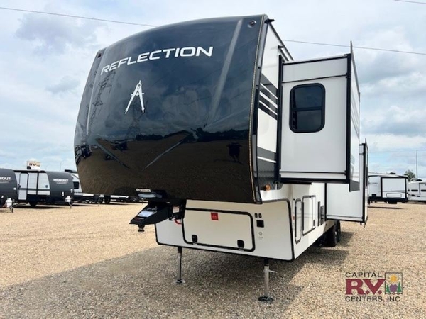 With any Reflection fifth wheel by Grand Design, you will have a solar panel for off-grid camping and a 60 amp charge controller and inverter prep, a Universal All-In-One docking station, unobstructed pass-through storage, and Goodyear Endurance tires. Each is constructed of gel coat exterior sidewalls, residential 5" truss rafters, walk-on roof decking, a fiberglass and radiant foil roof and front cap insulation plus laminated aluminum framed side walls, roof and end walls in slide rooms. Head inside to enjoy residential hardwood cabinet doors, premium Congoleum flooring, a spacious shower with a glass door, and many more comforts!