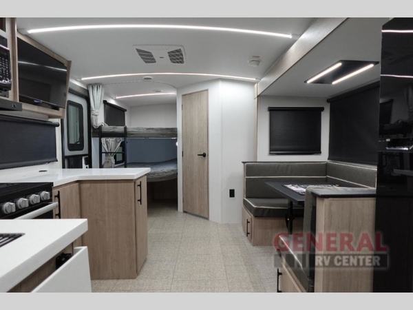 Unleash adventure with this incredible travel trailer! Sleep in style in the serene bedroom, featuring a plush queen bed, spacious wardrobe, and TV prep for entertainment. The kitchen is equipped with a pull-out pantry, 10 cu. refrigerator, microwave, and three-burner cooktop for delicious meal prep. Enjoy extra counter space with the flip-up countertop extension, optimal for easy and comfortable cooking. Family and friends can dine at the U-shaped dinette while watching the  LED HDTV for added entertainment. The full bathroom offers a shower, and linen closet. Kids will love the double bunk bed, perfect for taking a nap. On the exterior, you will find the outdoor kitchen, pass-thru storage, and 20 x 20 baggage door/trash can storage, ideal for a better organization of your belongings. Finally, create outdoor activities without worrying about the weather thanks to the 19 awning.