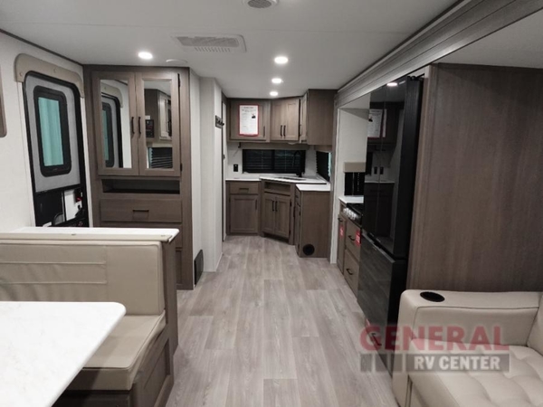 It will be so easy to enjoy camping trips in this travel trailer for five to six! The main living area is made spacious by the large slide out, and here you'll find the 60" sleeper sofa and the kitchen appliances. A booth dinette across the room provides a place to dine and play board games, or you can head outdoors to sit under the 17' power awning with LED lights. The queen bed in the front private bedroom will have you feeling right at home, and the TV prep here gives you the option to watch movies in bed. This model also includes a rear corner kitchen with ample counter space and a large sink, and you'll find the full bath in the other rear corner!