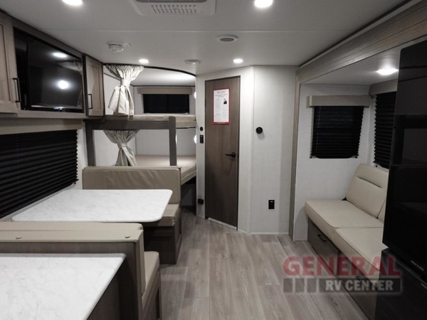 Camping with your larger family or when you want to take along a few extra friends is easy with this trailer. This unit sleeps nine with the double-size bunks in the rear corner, the 60" roll over sofa, and the queen bed in the front semi-private bedroom. The booth dinette can also be used to sleep a guest or two little ones at night once converted. Prepare your meals on the three-burner cooktop indoors, or out on the two-burner cooktop at the outside kitchen! You'll also find a handy exterior spray port and an outdoor refrigerator for cold drinks! It will be so easy to fill the dog's food bowl with the added pet dish under the refrigerator, and the full bath in this model means you don't have to use the camp's facilities. Having a 17' awning outside along with a large unobstructed pass-through compartment allows you extended living outdoors and plenty of space for all of your gear!