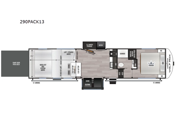 Fun at the campground begins with this toy hauler in tow! There is a 13' separate garage with a loft above for guests plus a patio deck to entertain guests. You'll also find a quick set bed system for additional sleeping space. Your crew can get comfy on the theater seating across from the fireplace, and there is an XL hidden pantry behind to keep food stocked. The two flip-up countertops with stools provides a fun place to dine since there is a window between, or you can head outdoors to enjoy some fresh air under the two power awnings. A full bath lets you freshen up after a trail ride, and the front private bedroom gives you your own space at night. This unit also features washer and dryer prep in the bedroom so you can add those appliances if you wish!