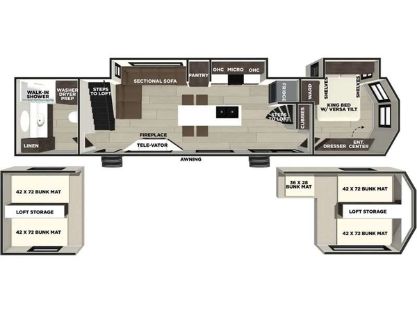 You will feel right at home in this destination trailer! It has not only has one loft in the rear with two 42" x 74" bunk mats, but also a second loft in the front with spiral steps leading up to two bunk mats. The front private bedroom features a king bed slide with Versa-Tilt to lay your head on at night with front windows to let in lots of natural lighting and sunshine in the morning. Relax in true comfort at night on the L-shaped sectional sofa across from the entertainment center with a fireplace. The kitchen island provides extra space to prepare delicious meals and comes with four bar stools to enjoy your breakfast each morning. Everyone will stay fresh and clean with a walk-in shower in the rear private bedroom, plus there is washer and dryer prep if you choose to add those appliances. Head outside through either the patio door or the second entry/exit door each day!