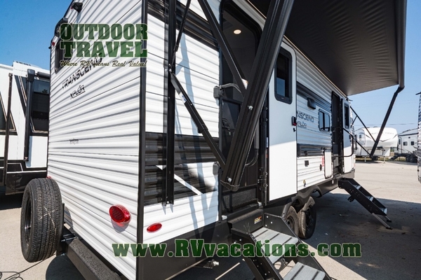 This fantastic travel trailer is designed to provide the ultimate in comfort, convenience, and adventure! The double-size bunk beds are perfect for kids, providing ample sleeping space and an under-bed storage space for all your belongings. The full bathroom features a linen closet, providing convenient storage for towels and toiletries. In the kitchen area, the U-shaped dinette is a great spot for creating memories that will last a lifetime, the refrigerator keeps your food and drinks fresh, while the microwave provides a quick and easy way to prepare meals. And for major convenience, the pull-out trash makes cleaning up a simple task. Take a nap in the comfortable front queen bed, which is a serene retreat, providing a comfortable spot to rest and relax. Jump to the exterior in a comfortable way with the double entry/exit door providing added convenience and flexibility, while the exterior awning provides shade and protection from the elements. The pass-through storage offers ample space for your outdoor gear and equipment.