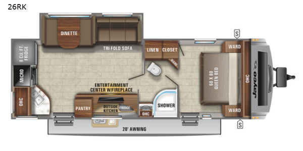 You will feel right at home in this travel trailer! The rear kitchen layout allows you to move about freely while you created a delicious meal with the three burner Furrion glass cooktop, the 8 cu. ft. refrigerator, and even the microwave. You can enjoy each meal comfortably at the booth dinette then play a card game or you can relax on the tri-fold sofa and enjoy the entertainment center with the electric fireplace and the 40" LED TV. You can start your days feeling clean and fresh by taking a hot, steamy shower in the glass 34" radius shower inside the walk-through bathroom, plus there is a linen closet and a small wardrobe for your storage needs. The front private bedroom offers a queen bed for a good night's rest with wardrobes on either side to keep your clothes neat, and even an entrance/exit door for you to slip out early in the morning for a quick fishing trip!