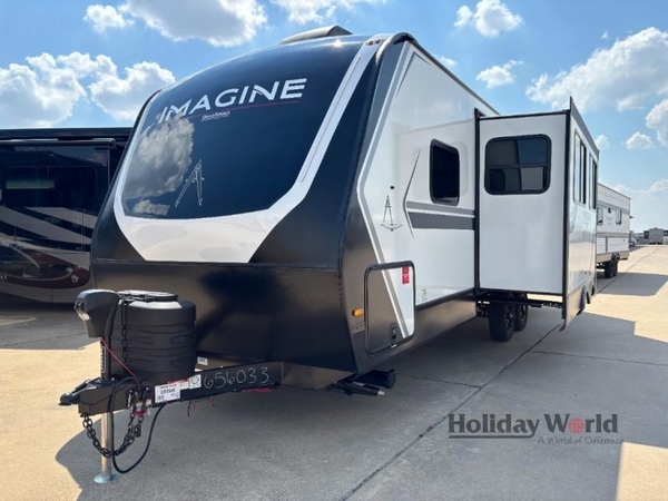 Where will you go with this Imagine travel trailer? The possibilities are endless! You can take your family on an exciting excursion because this trailer has enough sleeping space for everyone with a 60" x 80" queen bed in the private bedroom, a U-shaped dinette and tri-fold sofa in the main living area, and there is a set of 47" x 76" bunk beds with privacy curtains in the rear corner. You can come and go as you please with two entry doors, and the outdoor griddle and refrigerator will be fun to use when the weather is nice. The flip-up countertop extension will make it easier to prepare delicious home cooked meals and the shoe storage area helps to keep things neat and tidy.