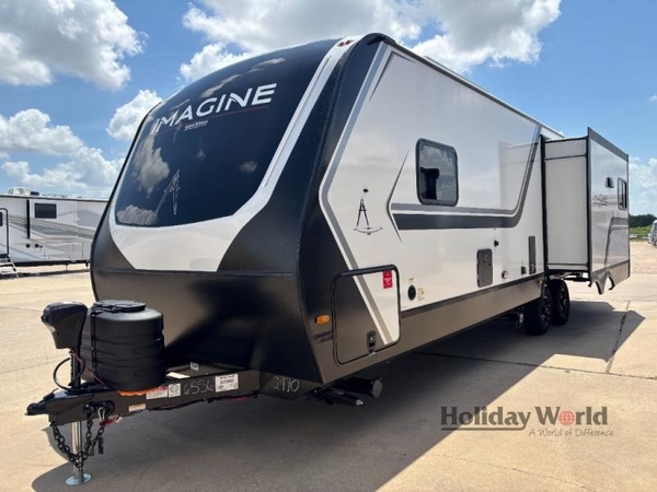 This Imagine travel trailer has opposing slides to provide you with ample living space on the interior once you've parked and set up! You can use the tri-fold sofa and theater seating to relax, and the booth dinette is another seating space that you can use for dinner time or game nights. The entertainment center has a LED HDTV with fireplace below, which is great for movie night.  When outside, you will love the two power awnings to sit beneath to keep you protected from the sun while you have fun at your campsite. The exterior also offers you an LP quick connect and a coax TV hookup.