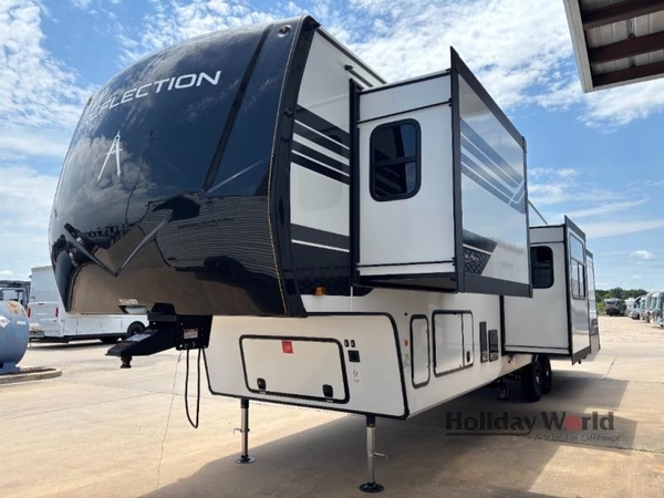 With any Reflection fifth wheel by Grand Design, you will have a solar panel for off-grid camping and a 60 amp charge controller and inverter prep, a Universal All-In-One docking station, unobstructed pass-through storage, and Goodyear Endurance tires. Each is constructed of gel coat exterior sidewalls, residential 5" truss rafters, walk-on roof decking, a fiberglass and radiant foil roof and front cap insulation plus laminated aluminum framed side walls, roof and end walls in slide rooms. Head inside to enjoy residential hardwood cabinet doors, premium Congoleum flooring, a spacious shower with a glass door, and many more comforts!