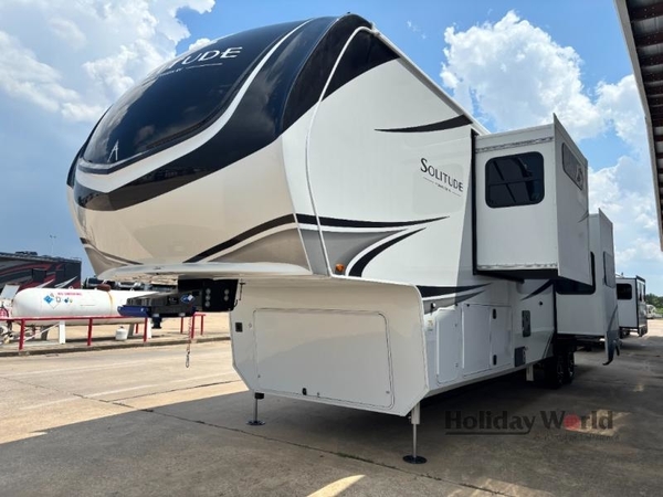 Each Solitude fifth wheel by Grand Design features a 101" wide-body construction, heavy duty 8,000 lb. axles, frameless tinted windows, and high-gloss gel coat sidewalls. You can camp year around thanks to the Weather-Tek Package that includes a 35K BTU high-capacity furnace, an all-in-one enclosed and heated utility center, and a fully enclosed underbelly with heated tanks and storage. Inside, you'll love the premium roller shades, hardwood cabinet doors, solid surface countertops, plus residential finishes throughout to make you truly feel at home. Each model also includes a MORryde CRE3000 suspension system, self adjusting brakes, and a MORryde pin box that will provide smooth towing from home to campground. Affordable luxury is possible with the Solitude fifth wheels; choose yours today!