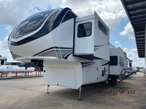 Each Solitude fifth wheel by Grand Design features a 101" wide-body construction, heavy duty 8,000 lb. axles, frameless tinted windows, and high-gloss gel coat sidewalls. You can camp year around thanks to the Weather-Tek Package that includes a 35K BTU high-capacity furnace, an all-in-one enclosed and heated utility center, and a fully enclosed underbelly with heated tanks and storage. Inside, you'll love the premium roller shades, hardwood cabinet doors, solid surface countertops, plus residential finishes throughout to make you truly feel at home. Each model also includes a MORryde CRE3000 suspension system, self adjusting brakes, and a MORryde pin box that will provide smooth towing from home to campground. Affordable luxury is possible with the Solitude fifth wheels; choose yours today!