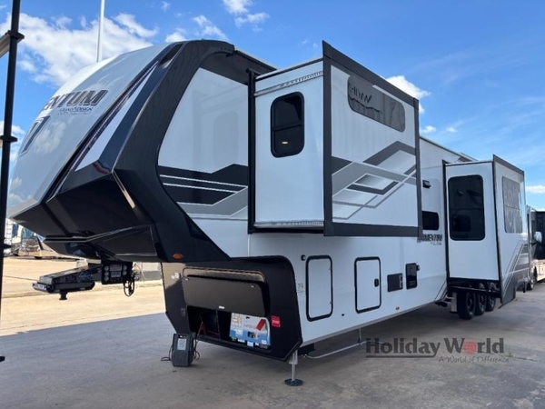 With any Momentum M-Class toy hauler by Grand Design, you will enjoy luxury at every turn! They have been constructed to a superior standard with a thermal roof design, triple insulated main floor and garage floor, and a Rail-Tite underbelly seal that will allow you to camp in all elements. Each model also features a, 8' 5" wide body chassis with a wide rail design, no wheel wheels, and a dovetail entry for easier loading. The Stealth A/C system provides maximum cooling power, and the CRE3000 suspension system means you can enjoy a smooth tow each time. You will love the luxurious interior with a professional grade stainless steel cooktop, interior color changing LED accent lighting, a fiberglass shower with a glass door, and solid surface countertops.