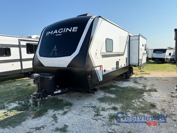 This Imagine travel trailer has opposing slides to provide you with ample living space on the interior once you've parked and set up! You can use the tri-fold sofa and theater seating to relax, and the booth dinette is another seating space that you can use for dinner time or game nights. The entertainment center has a LED HDTV with fireplace below, which is great for movie night.  When outside, you will love the two power awnings to sit beneath to keep you protected from the sun while you have fun at your campsite. The exterior also offers you an LP quick connect and a coax TV hookup.