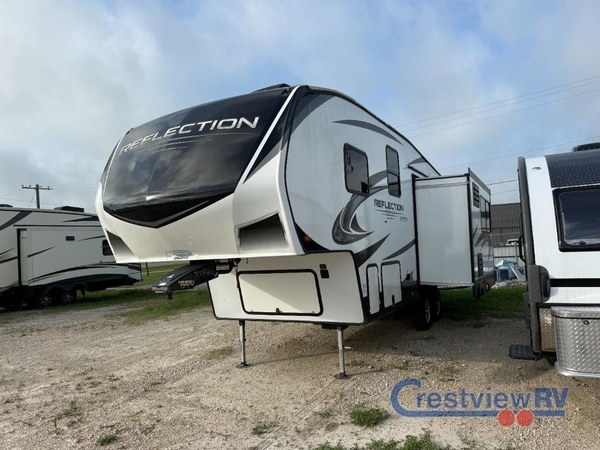 With any Reflection 150 Series fifth wheel by Grand Design, there is more available payload capacity and a broader range of half-ton trucks capable of towing this fifth wheel, and no slider hitch is needed thanks to the 90-degree turning radius which makes them short bed friendly and easier to tow. The mandatory Ultimate Power package provides a "One-Touch" automatic leveling system and a detachable power cord with LED light for easy setup, plus motion sensor pass-through lighting and entry lighting, and the Tire Linc TPMS will help you stay safe on the road. The interior offers residential luxury from the cabinetry and gunstock hardware plus the booth dinette to the residential-style window treatment. Make your refined decision today!