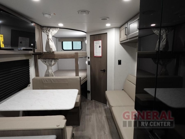 This is the perfect travel trailer if you like to camp with friends and family. Since there are double-size bunks, a queen bed in the front bedroom, plus a booth dinette and sofa, you can sleep eight campers each night! The three burner range and microwave in the kitchen will let you cook meals each day, and the 12V refrigerator will keep your cold items fresh. This model also includes a counter with extra storage underneath, a pull-out trash can storage for convenience, and a full bath to freshen up in each day. And you'll love having your own space in the front bedroom with a privacy curtain, dual wardrobes, and TV prep if you want to add a television!