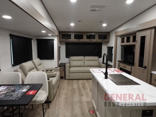 Get ready to enjoy everything the campgrounds and surrounding area has to offer when you are setup to camp in this fifth wheel! The two electric awnings offer protected areas creating outdoor living spaces; just grab your camping chairs from the unobstructed pass-through storage. And the interior offers a spacious living area and kitchen combination with dual opposing slides for maximum space. The hutch and kitchen island offer counter space to prepare and serve meals, and there is a large pantry for goodies. The 40" LED HDTV with a fireplace below provides entertainment before bedtime or on a rainy day. And the front bedroom offers privacy, a walk-around queen bed, and plenty of storage!