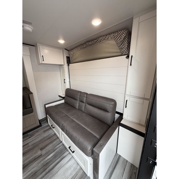 Inside, youll find solid hardwood cabinet doors with hidden hinges, giving the space a modern, residential feel. Oversized cabinets and under-bed storage ensure theres room for everything you need, while the lit exterior passthrough storage makes packing and unpacking a breeze.