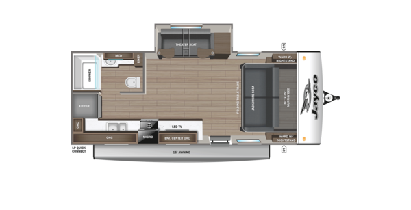 You never have to worry about running out of hot water in the Jay Feather, with the 60,000 BTU on-demand tankless water heater. The 55-gallon freshwater tank and heating element can warm up incoming water from the ground that is on average 55 degrees F.