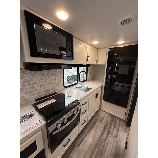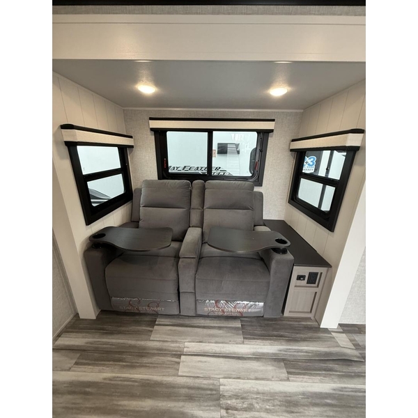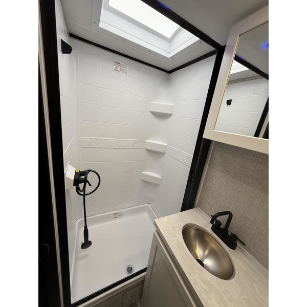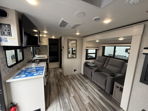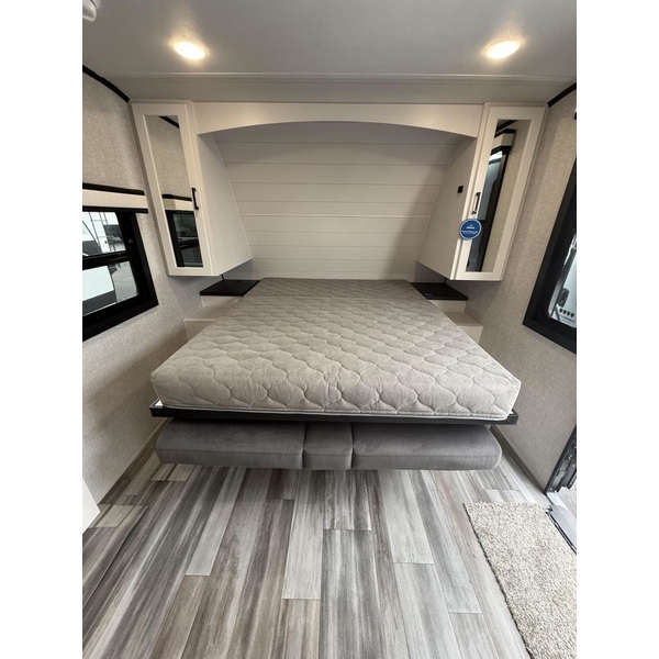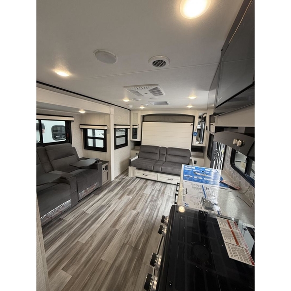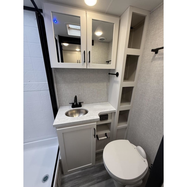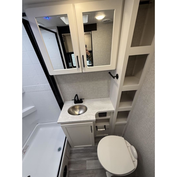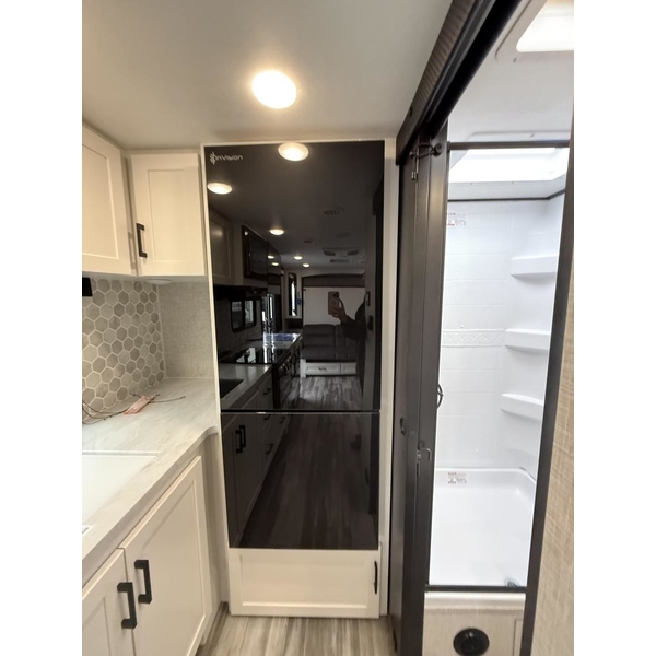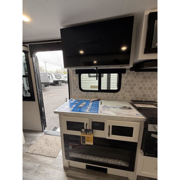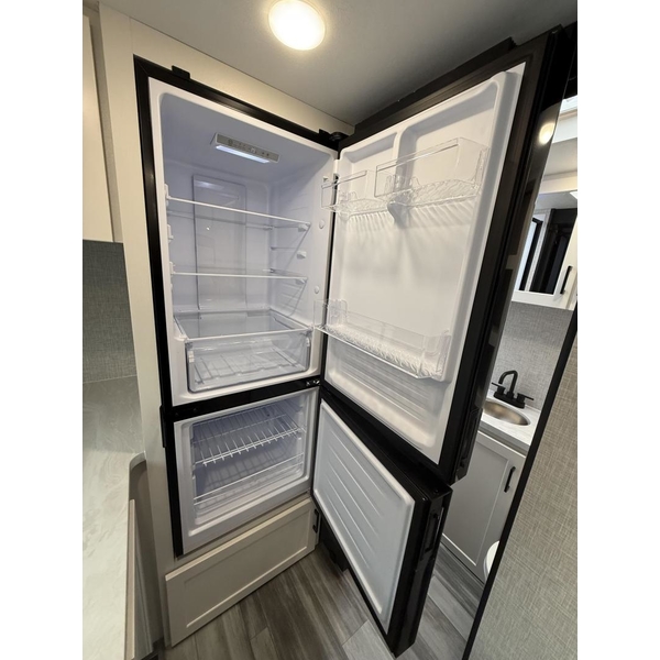 The amenities for 2025 dont stop there! In the kitchen area, you'll find seamless countertops throughout, a stainless-steel sink with a high-rise faucet and pull-out sprayer. You'll also be blown away by the all-new InVision Suite appliance package with an 11 cubic foot 12V fridge, standard in all Jay Feather models. This fridge has a shiny, black glass front with a two-door fridge over the freezer. Store more on the go with oversized cabinet doors and drawers. The cabinet doors are attached with hidden hinges to give each Jay Feather that sought-after residential look and feel.
