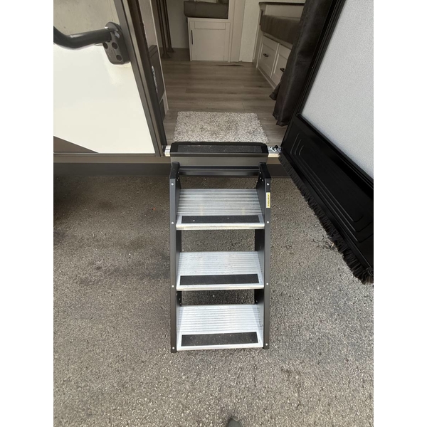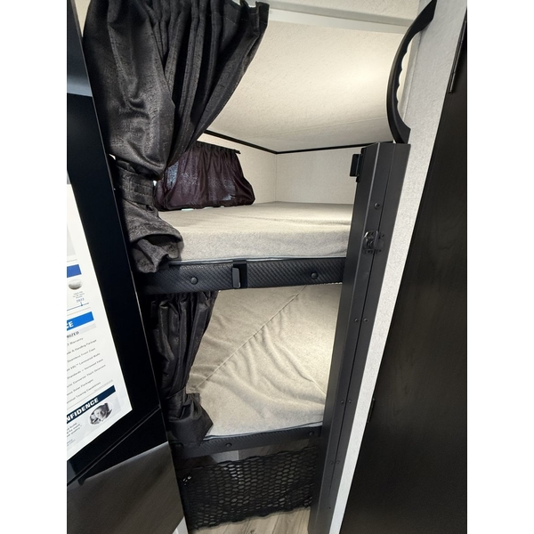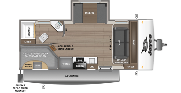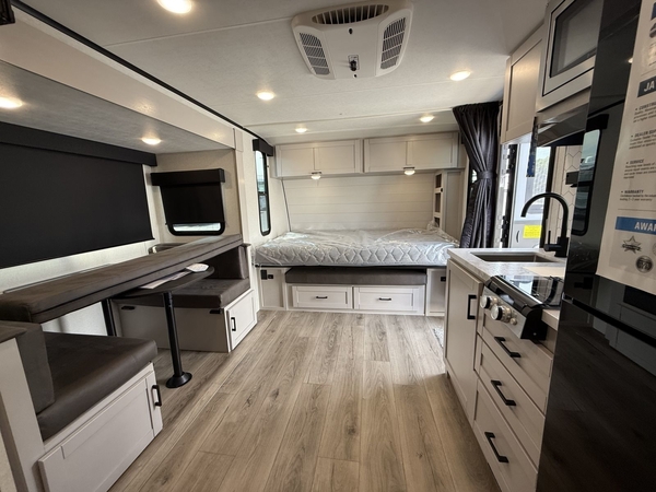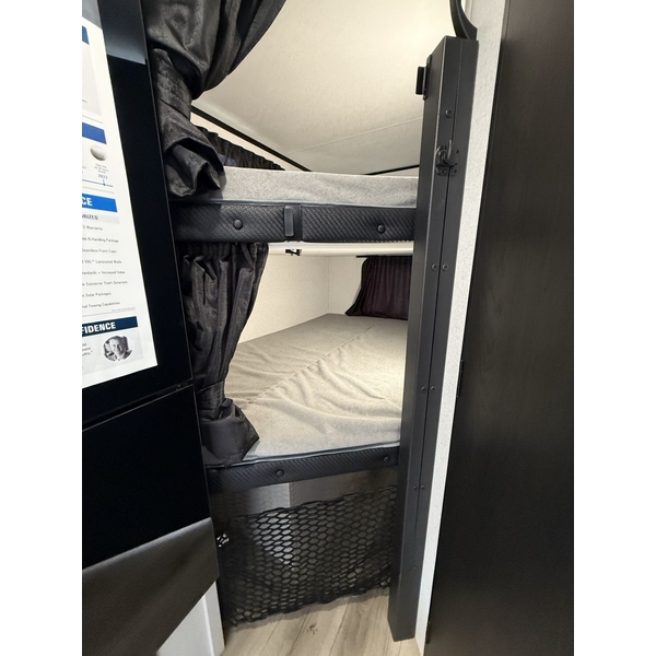 Additionally, this Travel Trailer comes standard with large, ventilated windows and standard 14-inch power roof vents in the bathroom for additional airflow and ventilation. These systems work together to ensure that you remain cool and comfortable, even on the hottest days. The Jayco Feather Air has some amazing features that set it apart from its competitors. First, the 60,000 BTU tankless water heater and 55-gallon freshwater tank provide an endless supply of hot water. The Jayco Feather Air also has an optional Rock-Solid Stabilizer System. This system is easy to use, and it creates a solid camping experience. Another factor in durability and comfort, is the plywood bed, bunk, dinette, and shower bases, which are all reinforced. The single-over-single bunks can hold 300 lbs. each, and the double-over-double bunks can hold 600 lbs. each.