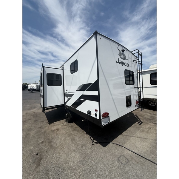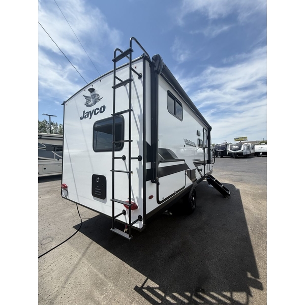 The exterior of the Jay Feather Air has its own list of standard features that make this entry-level Travel Trailer a must-have. We've stocked it with rear-mounted ladder for easy roof access, a maximized awning, an under-mount sewer hose carrier, a spare tire in case of emergencies and more.