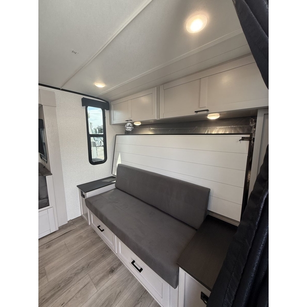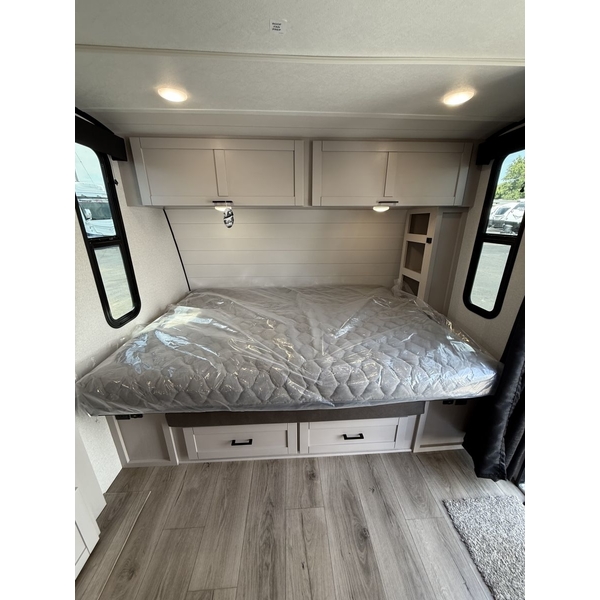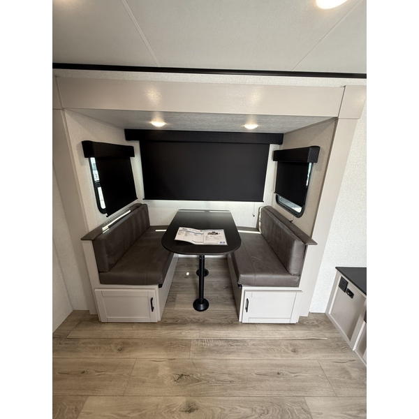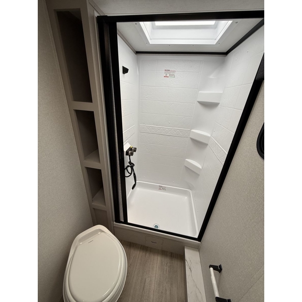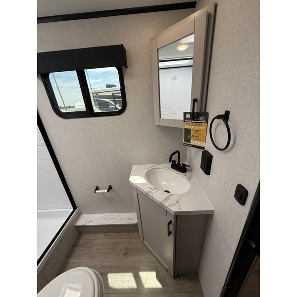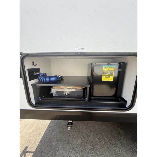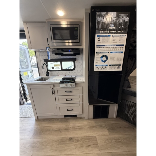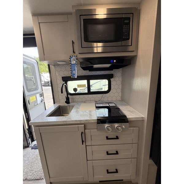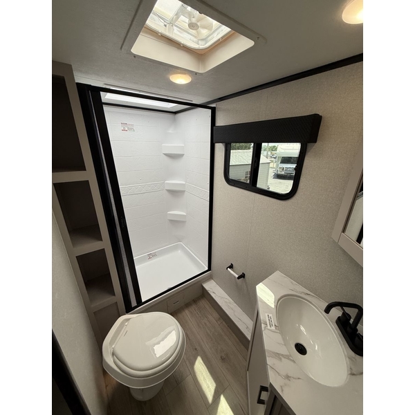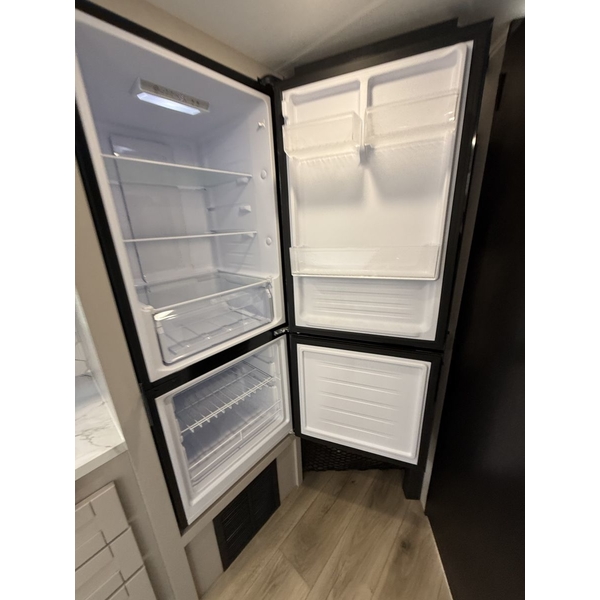 The cabinet doors and drawers are oversized, increasing storage space and maximizing the overall use of space. Hidden hinges and a seamless countertop in the kitchen add to the luxurious, residential feel. The InVision Suite appliance package comes standard and includes an 11 cu. ft. 12V fridge, which is five cubic feet larger than other brands. The kitchen in this lightweight Travel Trailer also features a stainless-steel sink. In the bathroom, youll find high-rise gooseneck faucets and a new roller-style shower enclosure, that opens up the space even more.