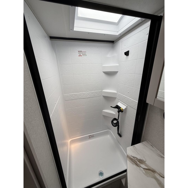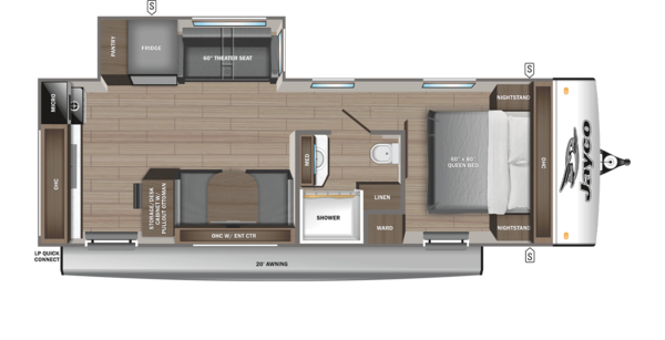 You never have to worry about running out of hot water in the Jay Feather, with the 60,000 BTU on-demand tankless water heater. The 55-gallon freshwater tank and heating element can warm up incoming water from the ground that is on average 55 degrees F.
