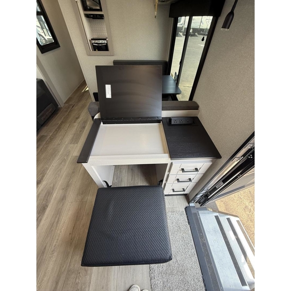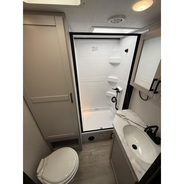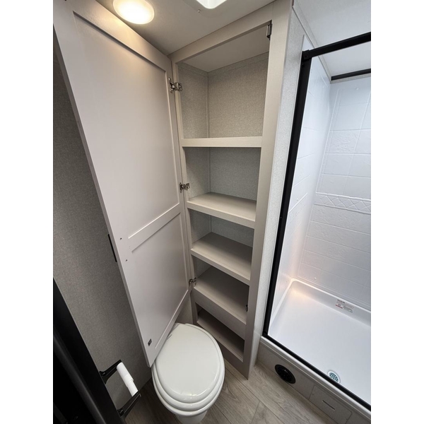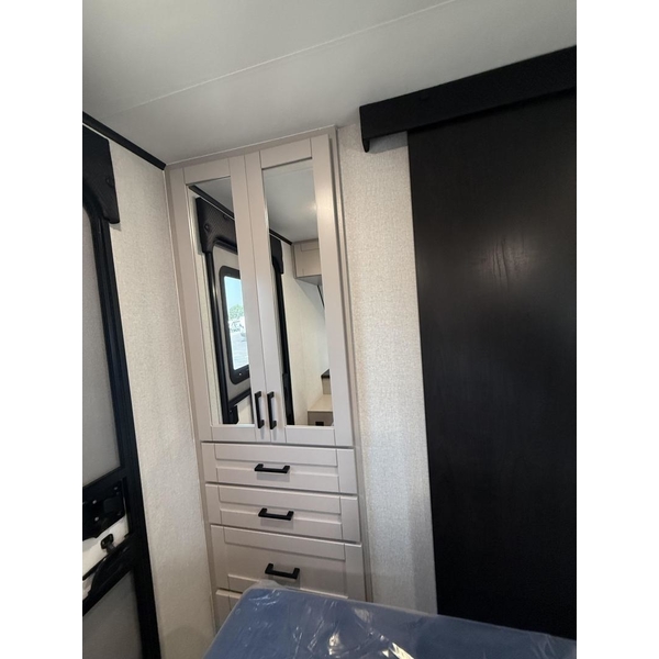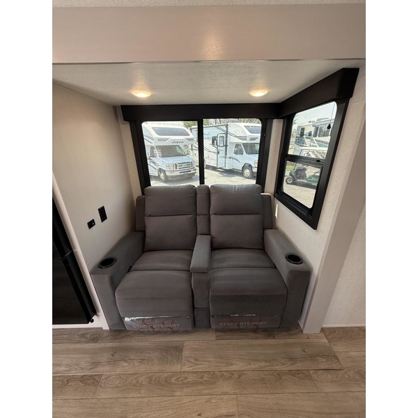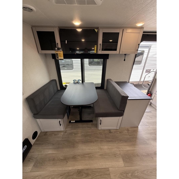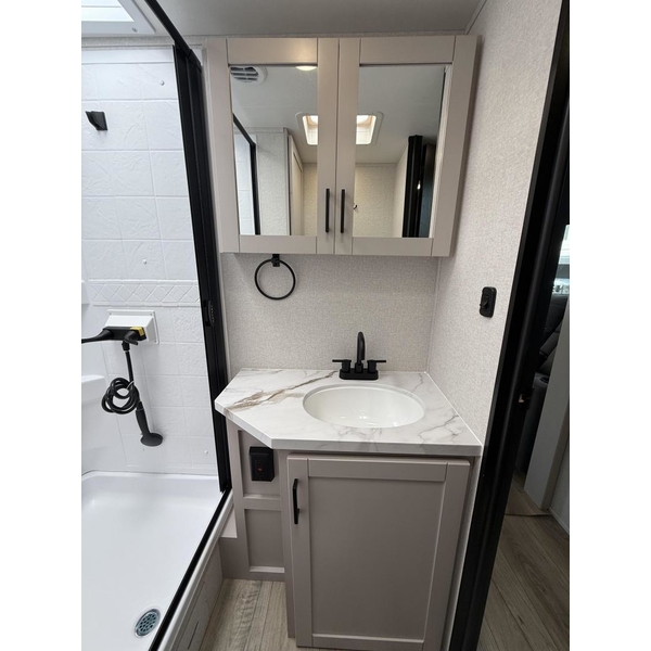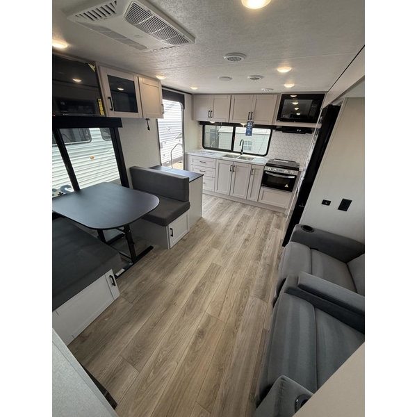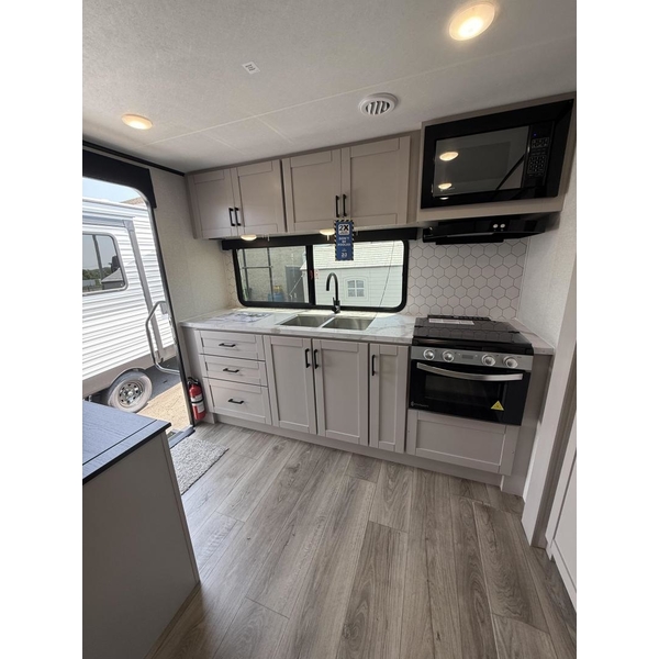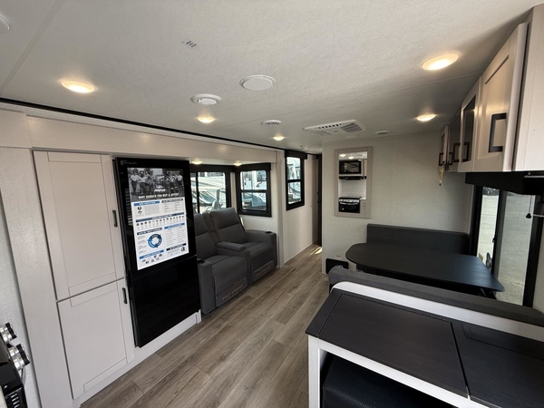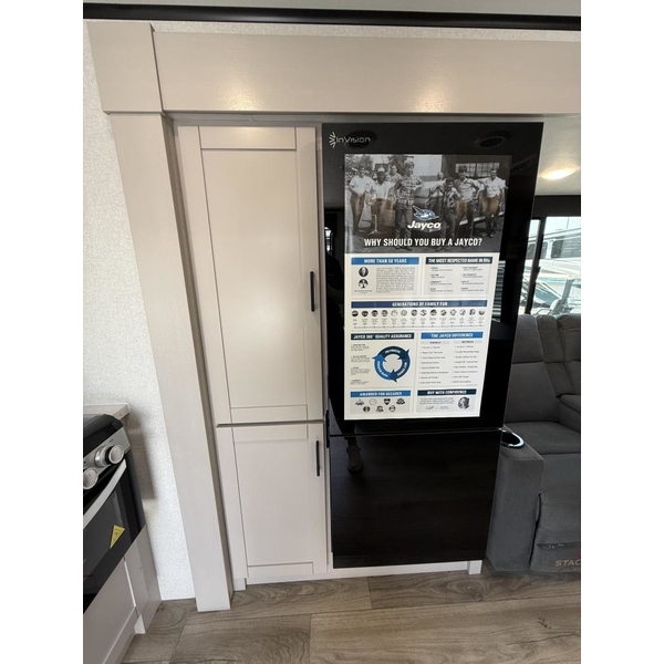 The amenities for 2026 dont stop there! In the kitchen area, you'll find seamless countertops throughout, a stainless-steel sink with a large window. You'll also be blown away by the all-new InVision Suite appliance package with an 11 cu. ft. 12V fridge, standard in all Jay Feather models. This fridge has a shiny, black glass front with a two-door fridge over the freezer. Store more on the go with oversized cabinet doors and drawers. The cabinet doors are attached with hidden hinges to give each Jay Feather that sought-after residential look and feel.