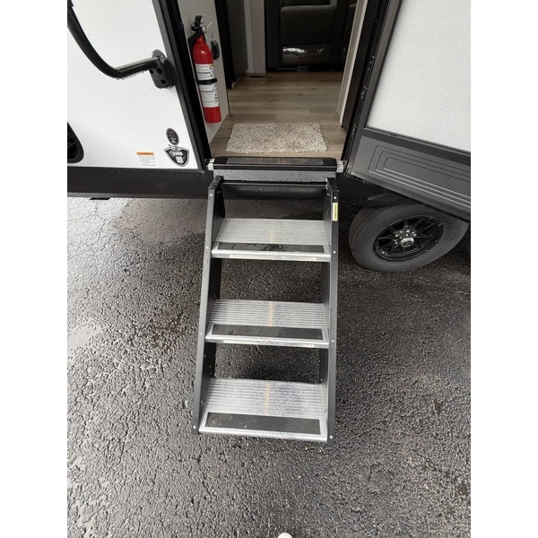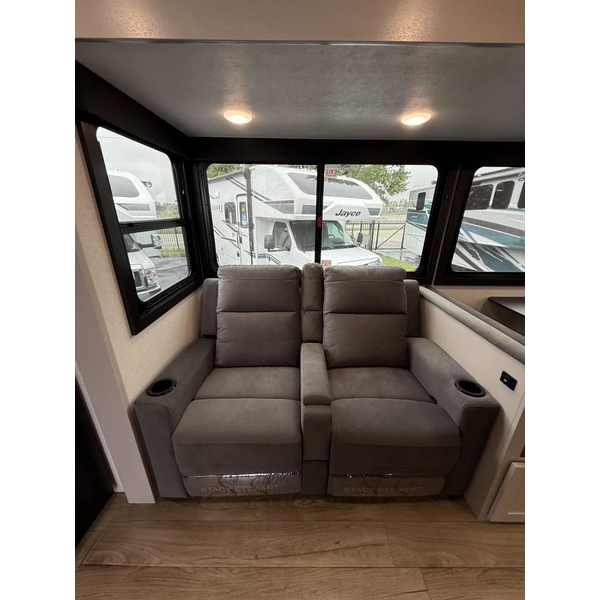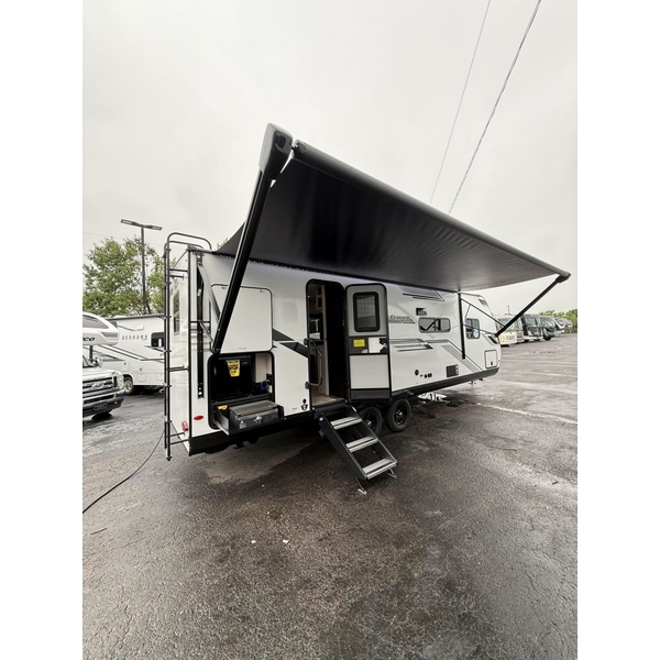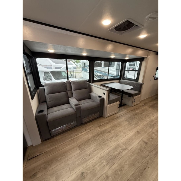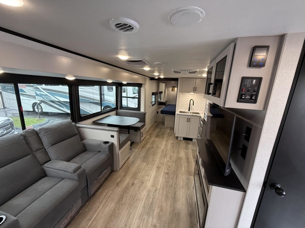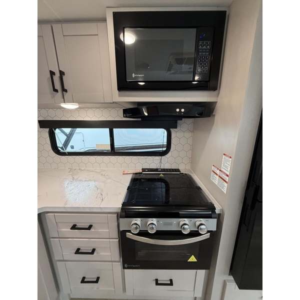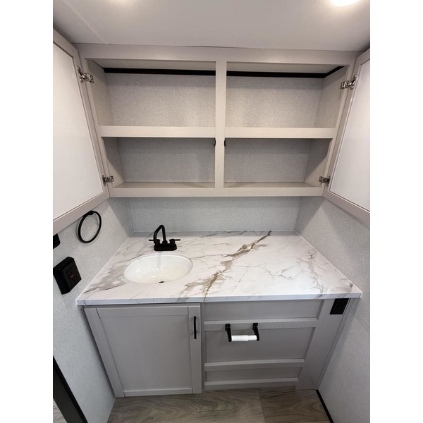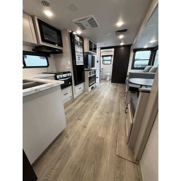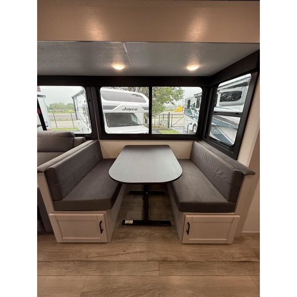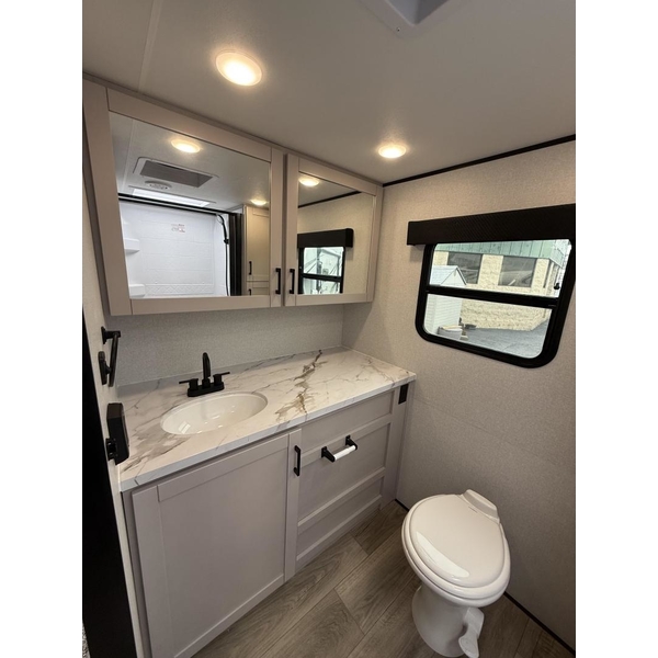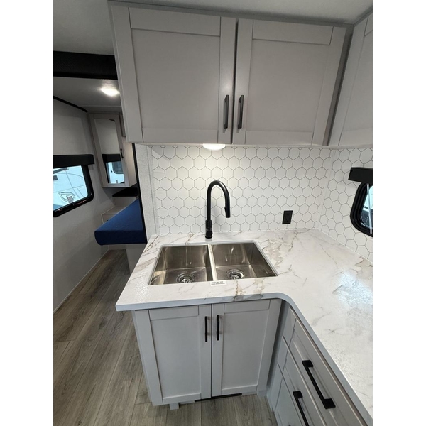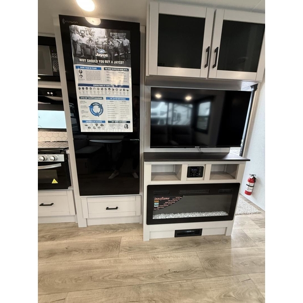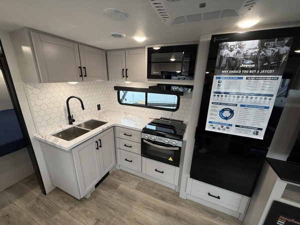 The amenities for 2026 dont stop there! In the kitchen area, you'll find seamless countertops throughout, a stainless-steel sink with a large window. You'll also be blown away by the all-new InVision Suite appliance package with an 11 cu. ft. 12V fridge, standard in all Jay Feather models. This fridge has a shiny, black glass front with a two-door fridge over the freezer. Store more on the go with oversized cabinet doors and drawers. The cabinet doors are attached with hidden hinges to give each Jay Feather that sought-after residential look and feel.