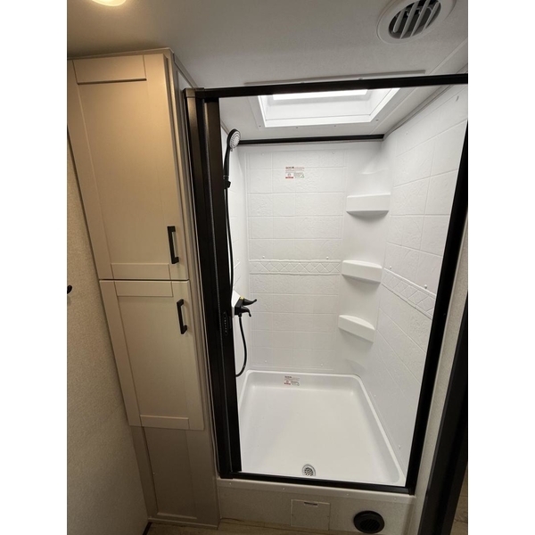 You never have to worry about running out of hot water in the Jay Feather, with the 60,000 BTU on-demand tankless water heater. The 55-gallon freshwater tank and heating element can warm up incoming water from the ground that is on average 55 degrees F.