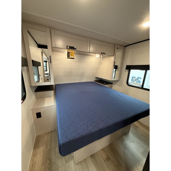Camping has never been more comfortable than in the 2026 Jay Feather Travel Trailer. This lightweight travel trailer is full of amenities, offers the same great interior decor you know and expect from Jayco, and several floorplans that are sure to fit your lifestyle. The bedroom in this RV is arguably one of the most comfortable places in the unit. For being a smaller Travel Trailer, its open-front bedroom features increased window sizes and 60 x 80 in. queen size bed, allowing for natural light a great walk-around space. Most Jay Feather floorplans now offer an optional 72 x 80 in. king bed; you truly will feel right at home on the road.