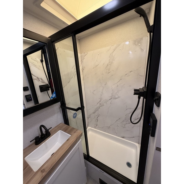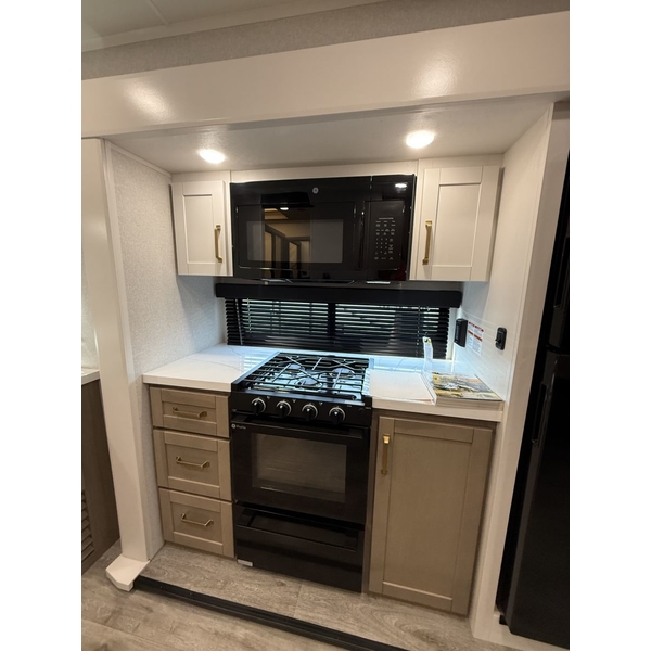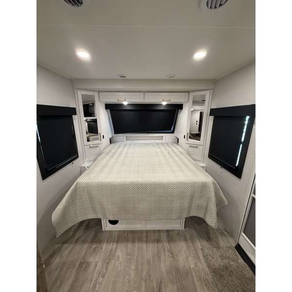 When its time to wind down, sink into the plush Olympic bed 6 wider and 8 thicker than standard RV mattresses featuring Cooling Tech for a more restful, cooler nights sleep. Wake up to breathtaking views through the large front windshield (most models), complete with a reflective blackout shade to keep the heat out and privacy in.