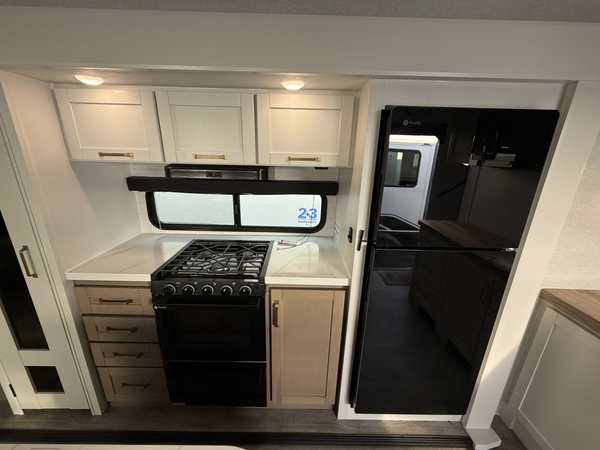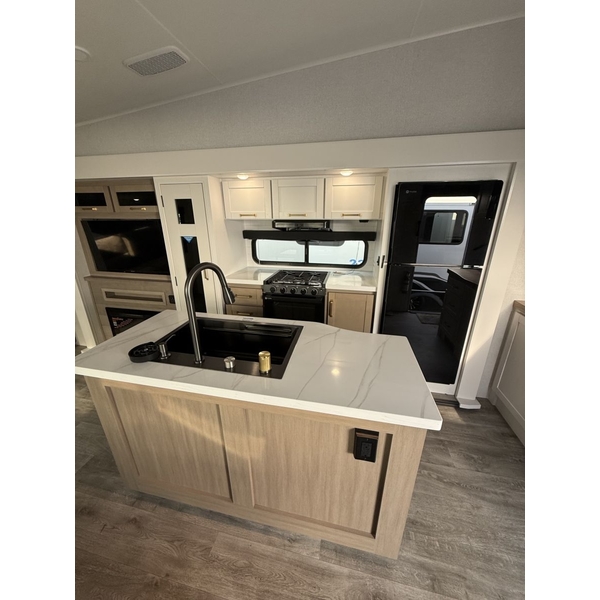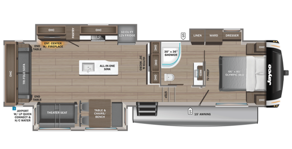 The Eagle HT isnt just about beautyits built for real-world adventure. JayCommand technology lets you control lights, awnings, and tank levels from your phone. A JayPort® outdoor kitchen hookup with hot/cold water means you can grill with a view of the canyon, and flush flooring throughout means no stubbing your toe in the dark.