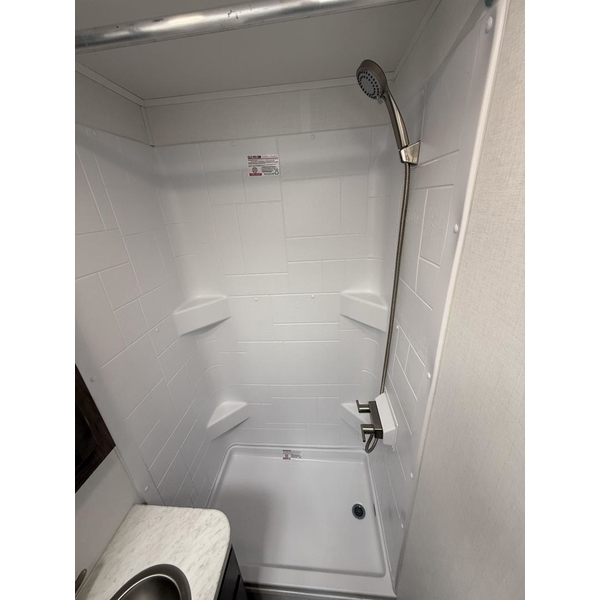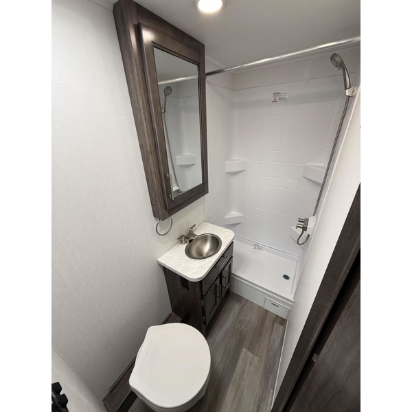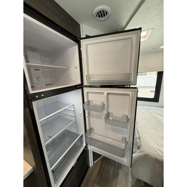Traveling through cooler weather is easier, too. Heated holding tank pads help prevent freezing in low temperatures so you can pass through chilly climates without worry. An optional 200W solar panel with a dual controller and a second house battery helps keep your power topped off, even in storage. This setup extends the life of your batteries and ensures your coach is ready to go when you are. For even more convenience, the electric-powered entrance step opens automatically when you open the door, and a simple power switch lets you keep the step extended while parked. The integrated battery compartment keeps everything clean and compact.