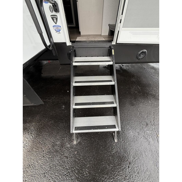 The garage is built for versatility, featuring HappiJac® electric-lift queen beds/convertible sofas, a Tuff-ply rubberized floor liner, and three-seasons removable wall/doors. Outdoor living is maximized with a rear ramp patio kit, anti-slip flooring, and a rear electric patio awning. Select models also offer an outside HALO griddle with JayPort® LP quick-connect.
