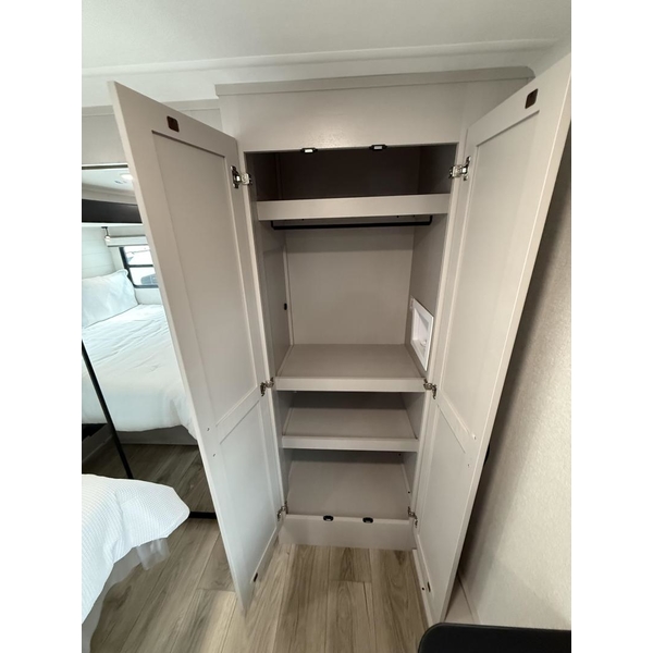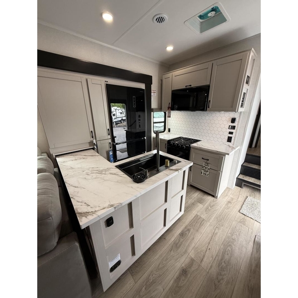 Power is never an issue with the NPS-powered Yamaha 6,000W generator and the Overlander II Solar Package featuring two roof-mounted 200W solar panels, 30AMP Digital PWM Solar Controller, and an 1800W inverter. Inside, residential-style luxury awaits with an Olympic 66 x 80 bed, handcrafted hardwood cabinetry, and a SuperSofa or theater seats with heat, massage, and LED lighting (select models). The kitchen boasts a residential refrigerator, 30-inch space-saver microwave, and a residential 21-inch oven.