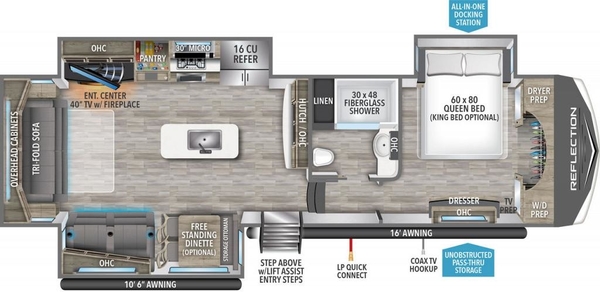 In stock and available is this all new 2026 Grand Desgin Reflection 337RLS Fifth Wheel with a Queen Size Bed (60' x 80"). The popular floorplan features a large living area with a Tri-Fold sofa and theater seating along with a very workable kitchen area and a private front bedroom with a washer/dryer prep cabinet. Optional Facotry installed equipment includes: Reflection Peace of Mind Package, Ultimate Power package, Deep Season Protection package, Solar Package, Goodyear tires, ABS Axle Assembly with Sway Control, 2nd Exterior Power Side Awning, 16 cubic foot refrigerator, 370 watt solar panel upgrade, Internet Ready (router and Starlink Prep), Swivel Dinette with (2) chairs and storage ottoman, 8,000 ducted 2nd Roof air conditioner (26,000 btu total). NO HIDDEN FEES OR CHARGES ARE COLLECTED AT COACHLIGHT !! We can not post our actual sales price per manufacturer's policy, so CLICK THE RED INTERENT PRICE BUTTON to receive it. All units come with Grand Design's 1/3/5 year warranty program. The window sticker on this listing will provide more information and specifications on this fifth wheel. Feel free to give Norm or Doug a call at 800-799-7444 for more information or any questions.
