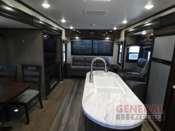 This fabulous Jay Flight travel trailer comes with large opposing slides to create extra interior living space! Because of that added space, you'll find a kitchen island which will make it easy to prep dinner or wash dishes afterwards. Another fabulous addition is the master suite up front that has its own private entrance into the bathroom, and since there is a skylight above the radius shower, you'll have more head space while you get clean.