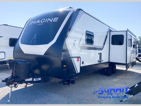 Just imagine leaving the world behind and secluding yourself away with your favorite people in your Grand Design Imagine travel trailer! The Imagine has been designed to enjoy extended season camping and includes a high-capacity furnace, a heated and enclosed underbelly with suspended tanks, a designated heat duct to the subfloor, and a high-density roof insulation with attic vent. You'll have maximum head room on the interior with 81" radius ceilings, and large panoramic windows to let in natural lighting. The exclusive drop-frame pass-through storage compartment is going to allow you to bring along lots of equipment, and the universal docking station is an all-in-one location for utilities and hook-ups. You'll also have oversized tank capacities so that you can fill and empty your tanks less often.
