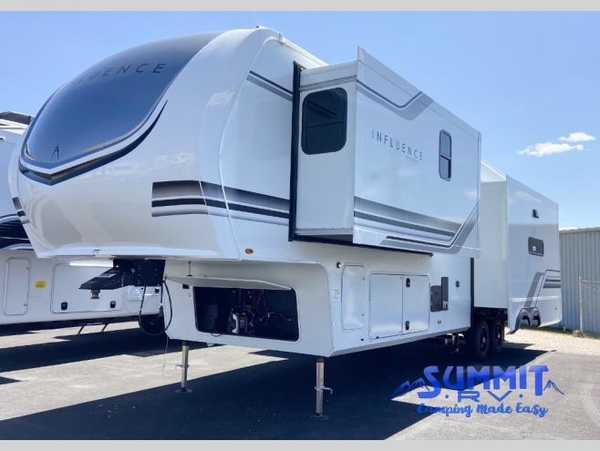 Any Grand Design Influence fifth wheel features five-sided aluminum cage construction with a walk-on roof and a fully enclosed underbelly with heated tanks and storage for all weather camping. For peace of mind, the MORryde CRE3000 Suspension system will provide safe and smooth towing, and the 101" widebody construction offers all the room you need and that is before multiple slides are fully engaged. You will appreciate the Keyed-Alike locks, slam-latch baggage doors with magnetic door catches, exterior security light, and SolidStep entry steps. On the inside, Congoleum flooring, premium roller shades for privacy, a hallway handrail for safety, and nightstands with USB ports to keep all of your electronics fully charged. You will also love the On Demand tankless water heater when showering, plus the added heat and ambiance from an electric fireplace, and so much more!